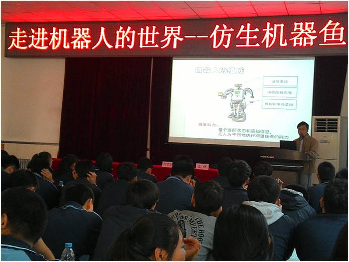 王硕研究员是2013年北京市科学技术奖一等奖项目“仿生机器鱼高效与高机动控制的理论与方法”的参与完成人。本次报告,他结合获奖项目,以机器人的原理和发展为切入点,深入浅出地为同学们介绍了什么是机器人、机器人的组成以及机器人在生活中的各种应用。王硕老师为同学们打开了一扇五彩纷呈的大门,保姆机器人、会踢足球的机器狗、做手术的机器人医师、工厂作业机器人、上天入海的探索机器人、海陆空机器人战士……各式各样的高精尖机器人生动形象地展现在大家眼前,极大地开拓了同学们的视野。讲堂内容丰富,妙趣横生,让同学们了解到前沿的机器人科学知识,有助于激发同学们对科学的热爱,培育创新精神和创新意识。