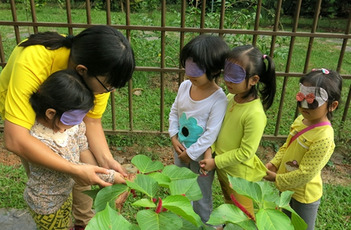 30日,大班的小朋友到芬芳美丽,四季常青的藤本园,用触觉、听觉、嗅觉、味觉和视觉全方位感受了小花园的神奇。首先在蒙眼的状态下,体验花型独特的狗尾红。原本熟悉的狗尾红,当孩子只能靠触摸感知它的形状和大小时,孩子们能想象的空间变大了。有的说它毛茸茸的像动物的尾巴,有的说它是大大的毛毛虫。有的说叶子粗糙不平像树皮,有的说叶子大大的可以把手包起来就像一块布。除了狗尾红,孩子们还用耳朵聆听到数种小鸟的叫声,仔细辨别了声音所在的方向。随后,小朋友来到香料植物区,通过看一看,闻一闻游戏体验了韭菜、葱、小米辣、鱼腥草等植物。最后,孩子们还探索了一个小池塘,观察体验了小蝌蚪、螺蛳、水黾等在水里生活的动物。