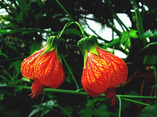 现在正在盛放的风铃花,还有一个好听的名字——纹瓣悬铃花。其花腋生,花柄长而细的,花朵橙红色,具红色纹脉,瓣端向内弯,似钟形显得美丽而可爱。一朵朵半展开状的花朵挂在柔软的枝条上,迎风摇曳,像一串串发音清脆的风铃。风铃花原产南美洲,属于锦葵科(Malvaceae )茼麻属常绿灌木,喜温暖湿润和阳光充足的环境,也耐半阴,适宜在含腐殖质丰富、疏松透气的沙质土壤中生长,在我国福建、浙江、江苏等地都有栽培。在条件适宜的地区,周年开花,四季常绿,其优良性状在观赏植物中很罕见,倍受人们喜爱。此外风铃花还具有工业价值和药用价值,茎皮可以取纤维加工编织用品,叶和花具有活血袪瘀、疏筋通络等功效。