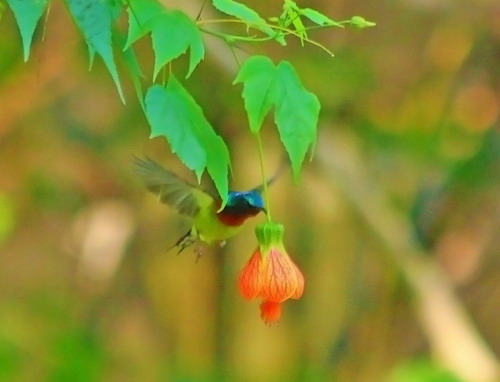 1月22日,中国科学院华南植物园生物园里的风铃花(Abutilon striatum Dickson )绚丽绽放,吸引了美丽的叉尾太阳鸟前来采蜜,更吸引了一大批花鸟类摄影爱好者前来拍摄“花鸟图”。他们来自广州、深圳、珠海、厦门、苏州等全国各地的摄影爱好者,在每年冬季风铃花盛开的季节,扛着“长枪短炮”和小板凳一早就来到植物园,占据有利地形。为了拍到满意的鸟儿吸食花朵、振翅欲飞的的画面,一拍就是一整天。