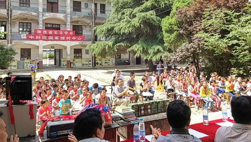 活动中,还展出了根据国家授时中心研究员刘次沅《陕西关中古代天文遗存》一文制作的系列展板,陕西省天文学会秘书、国家授时中心刘建荣还向五丰小学捐赠了时间、天文、航空等方面科普读物,光盘、计时沙漏和《中华上下五千年》、《世界经典故事》等书籍。