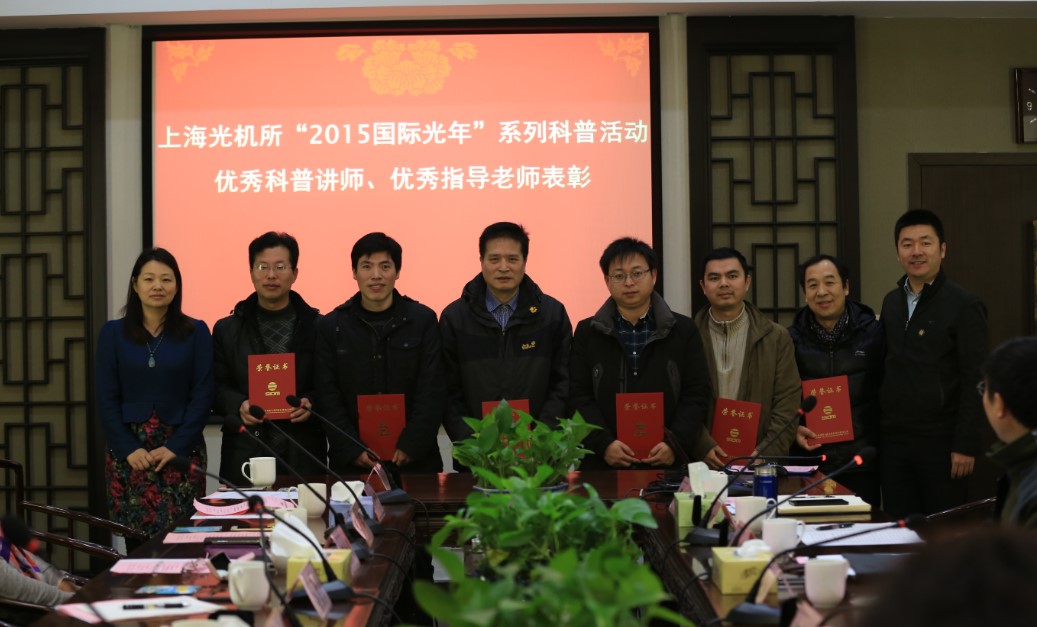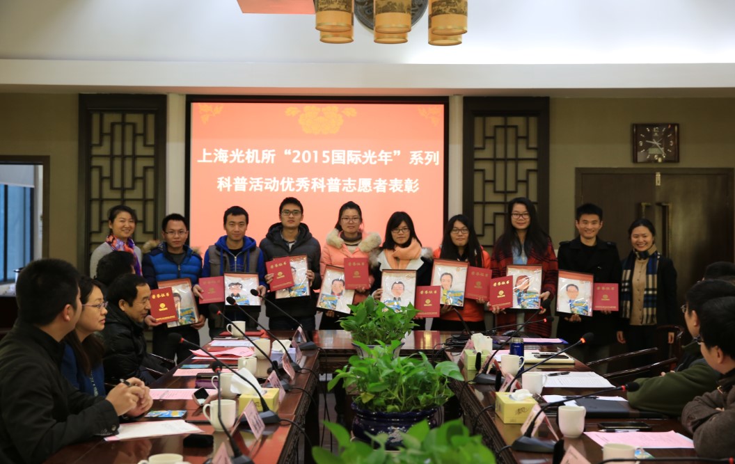2016年1月12日,中国科学院上海光学精密机械研究所“2015国际光年”系列科普活动总结表彰会议在溢智厅召开。中科院科学传播局综合处处长徐雁龙、科普与出版处处长陈红娟,上海市科委科普工作处副处长朱翯,嘉定区科委副主任陆凤,上海光机所所长李儒新、书记邵建达、原副所长祝如荣等领导以及志愿者共50余人参加了会议。会议由邵建达主持。