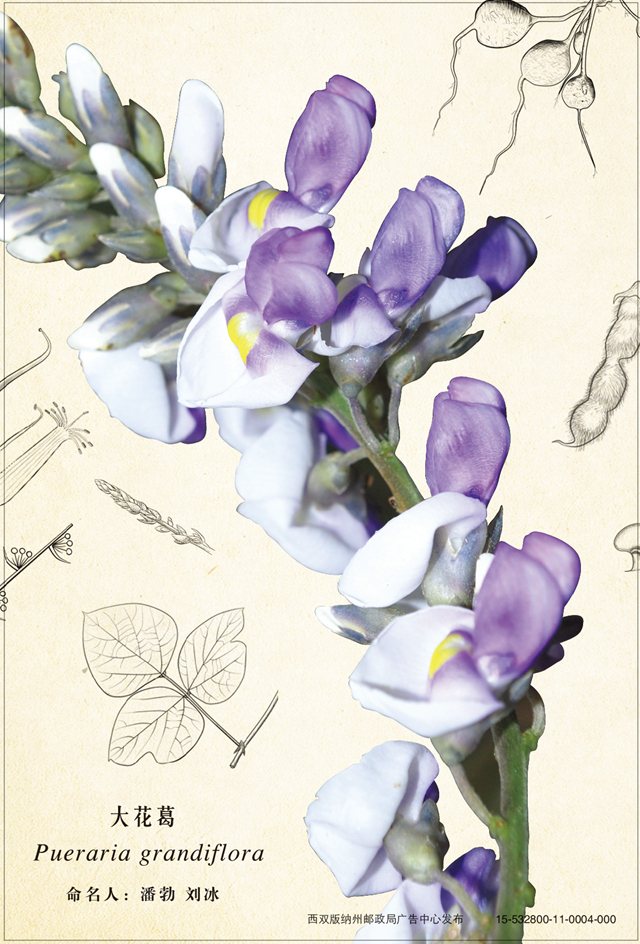 1月22日,中国科学院西双版纳热带植物园根据该园科研人员潘勃等发现并命名的一个豆科新种——大花葛(Pueraria grandiflora),与当地邮政部门合作推出了一套以潘勃拍摄及绘制的大花葛图片作为背景的主题明信片,以此向公众传播科学研究背后的故事和文化。