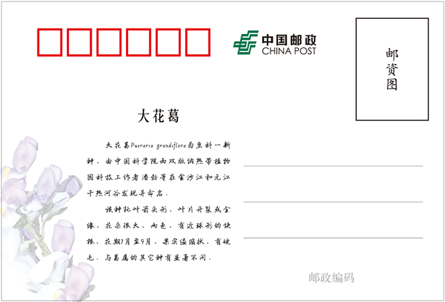 以潘勃拍摄及绘制的大花葛图片作为背景的主题明信片