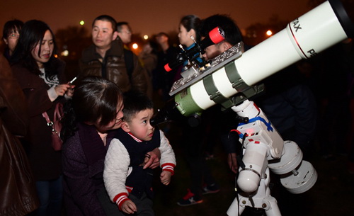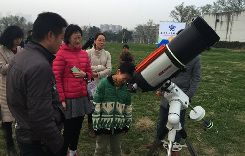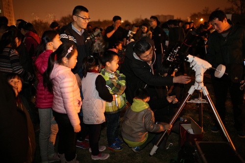 夜渐渐深了,风也渐渐凉了,直到晚上九点多市民才依依不舍地离开。欣赏天文盛景,领略宇宙魅力,这次活动让众多市民了解了天文知识,感受了天文的魅力,热爱上了头顶上的星空,从而让市民们在内心深处认识到:为了不让雾霾吞噬这些美丽的星空,就要呵护环境、关爱地球,为蓝色星球转变生活方式,将环保理念常记心中!