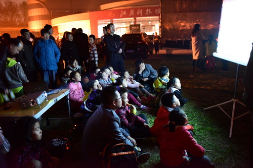 在张勃作报告的期间,南京天文爱好者协会的会员们也在室外忙碌着,他们已经在科技馆外的草坪上架起了七台天文望远镜。此时,南京的天气也非常配合这次活动,原本阴霾的天空,云层渐渐被风吹散,一轮盈凸月也透过云雾露了出来。为了配合这次活动,江苏广播电视总台特意关闭了电视转播塔上的液晶大屏幕,营造关灯气氛,为晚上的观测活动提供了条件。天色渐黑,各架望远镜聚向月球,透过镜头,月亮仿佛瞬间被拉近了几十倍,月球上的山地、月海以及大大小小的被撞击形成的环形山、辐射条纹清晰可见。前来参加活动的市民团团围在望远镜周围,透过小小的目镜欣赏这美妙的景象,一睹月面的风采。随着夜幕的降临,木星也渐渐升高,透过高倍的望远镜,可以清晰地看到木星上的条纹和它的四颗大卫星,此时正值木星掩食木卫一,木星大圆面正在慢慢吞噬旁边的一颗小星星,这着实考验了一下市民们的“眼力”。小型的投影仪也架了起来,播放着介绍宇宙的科普视频,并实时将望远镜中的画面投影在幕布上,幕布周围,很快便被市民们围了个水泄不通,南京的市民兴高采烈地在看起了“露天电影”。这期间紫金山天文台的工作人员和南京天文爱好者协会的成员还热心地向市民介绍了望远镜的原理,指导市民使用星图软件帮助观测星空,为市民答疑解问,讲解天文知识。