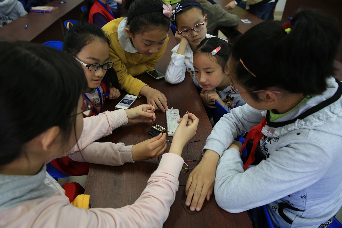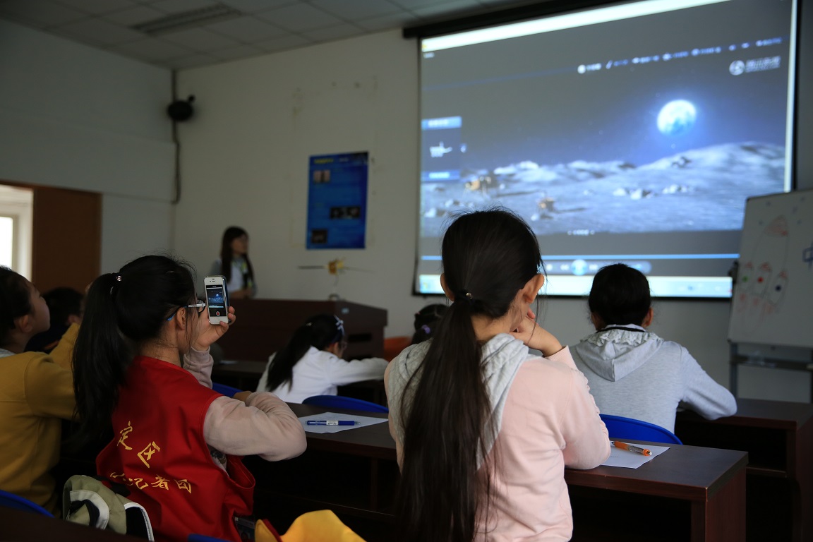 上海光机所科普志愿者首先为学生们送上了一堂主题为“走进神奇航天世界”的科普课堂。课堂上,志愿者为大家介绍了首个“中国航天日”的由来和意义,以及上海光机所空间系列激光器和空间时频技术等在航天方面的突出贡献,精彩的讲解,生动活泼的科普视频,令在场学生们深深地被航天科技的魅力吸引。活动中,上海光机所“嫦娥系列空间激光器模型”被请进课堂,让学生们大饱眼福。学生们还亲自动手体验了点亮LED、三原色验证、光纤通讯等多套互动实验,课堂后,青少年学生们在志愿者带领下,走进实验室,参观了大科学装置。