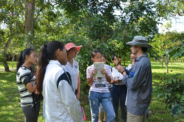 那么,常见热带水果又有哪些呢?同学们如数家珍一般,说出了菠萝、菠萝蜜、芒果、荔枝、龙眼、红毛丹等等生活中常见的热带水果,然而同学们对这些果树长什么样却并不太了解。为了使同学们更好地认识这些热带果树,谭运洪带领同学们走进百果园,一起观察柚子的单身复叶、叶片的油腺点,讲解荔枝、龙眼、蛋黄果等叶、果实、种子的识别要点,最后同学们能根据谭运洪所讲知识点独立判断红毛丹、人心果