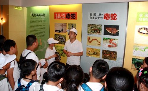 在成都生物所两栖爬行科普馆,一幅幅图片配合着标本的注释,将同学们一下带入了茂密的原始森林。在科普志愿者的讲解下,同学们仿佛身临其境,与两栖爬行动物玩起互动。