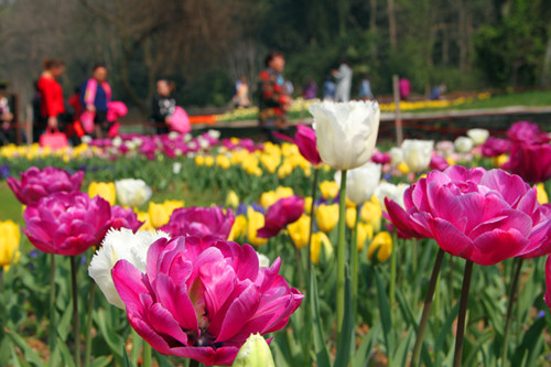 武汉植物园展示的郁金香品种达100多种,在郁金香的品种展示上达华中之最。会变色的“狐步舞”“维多娜”、花朵随机开出6种颜色的“混合料”,颜色极其罕见的棕黑色郁金香“洲际”等品种一 一亮相。武汉植物园在郁金香花型的展示上更加丰富,有杯型、钟型、漏斗型、牡丹花型、百合花型、流苏型、鹦鹉型等多种花型。如花朵似百合的“西点”“芭蕾舞女”、花瓣扭曲如火红色鹦鹉羽毛的“火红鹦鹉”、花瓣边缘有清晰的毛刺,状似流苏的“大河之舞”“蜜月”等。郁金香以色彩丰富多变闻名于世,武汉植物园内,红、橙、紫、白、黑、绿、黄、复色等14个色系40多个花色的郁金香绚丽多彩,黑色的“黑英雄”“夜皇后”、橙色的“橙色蒙特”、紫色的“蓝钻石”、花瓣白中带绿斑的“春绿”……各色郁金香如天然调色板,妆点出最色彩斑斓的大地艺术。