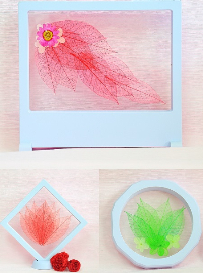 通过化学处理后,自己动手去掉叶片上的表皮和叶肉组织,留下网状的脉纹,再通过纯植物提炼的色素进行染色。