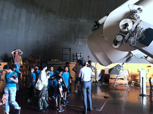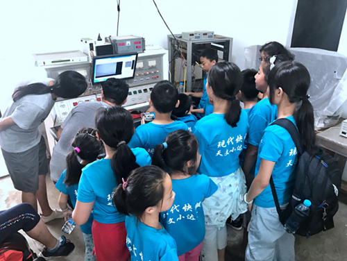 22日,营员们来到紫金山天文台赣榆观测站。赣榆站观测站拥有一架口径为26厘米的太阳精细结构望远镜,望远镜为赤道式双筒结构,一个筒观测太阳色球,另外一个筒观测太阳光球。博士周团辉告诉小营员们,太阳活动有11年的周期性。如果是太阳活动高峰年,太阳表面有很多黑子,就像太阳长了一个个黑痣,太阳活动频繁。近年来是太阳活动的低谷期,日面已连续40多天没有黑子出现。到2022年又将迎来太阳活动高峰年,到那时,太阳的表面会出现很多黑子、暗条和耀斑等。正因为太阳对地球的影响很大,科学家们希望可以更近距离地观测太阳,科学家正在积极研制专用太阳观测卫星ASO-S,将于2022年上半年择机发射。