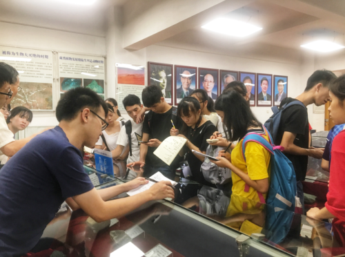 在标本陈列馆,同学们在两位老科学家志愿者的带领下,学习玄武岩的绳状构造,古生物的起源,天然水晶和人造水晶的区别,可燃冰的形成及其他各类岩石的形成机理。在了解到20世纪50年代生产的中国第一块人造水晶,及2009年发现的中国第一个得到国际承认的岫岩陨石坑与广州地化所有深远关系时,同学们表达了赞叹和景仰之情。