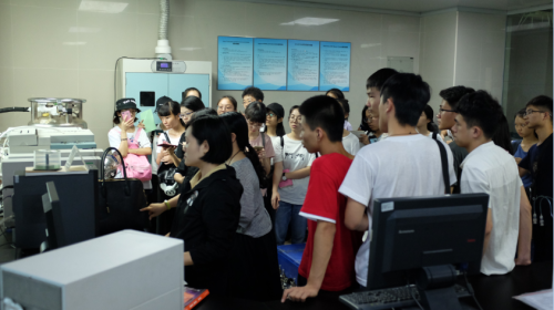 同学们来到有机地球化学国家重点实验室大气监测站、烟雾舱和VOC实验室。科研人员详细介绍整个大气颗粒物的采集和分析流程,高浓度PM2.5与低浓度PM2.5的区别特征,建立大气烟雾舱的目的及科学意义,以及挥发性有机物的采集、浓缩和检测等,使同学们对大气颗粒和挥发性有机物的研究有了直观认识。在了解挥发性有机物的GC-MS测定时,同学们对测定结果谱图产生兴趣,向科研人员请教谱图所表达的含义,如何从谱图中得到所需科学信息等问题。