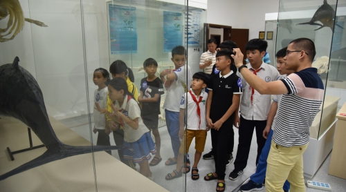 同学们参观鲸豚标本展示平台