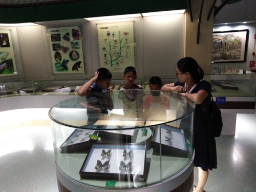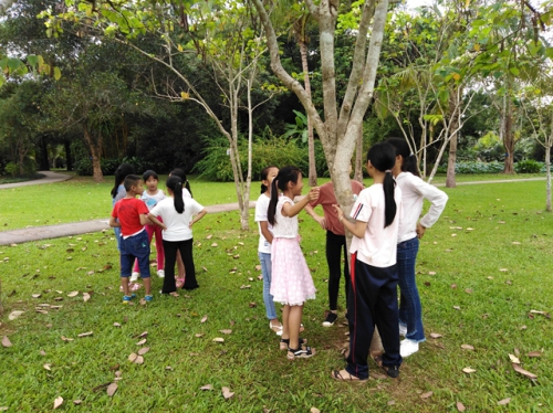 活动包含自然观察、生态游戏体验、博物馆志愿讲解、文化课交流等。在自然观察环节,同学们发现螽斯腹部破损,里面慢慢露出一条细细长长慢慢卷曲起来的棕褐色的丝,那是螽斯肚子被人踩破后漏出来的肠道一类的东西,还是什么奇怪的虫子呢?通过观察,同学们直观认识了螽斯被铁线虫寄生的现象。生态游戏环节,孩子们依靠肢体语言告诉同伴自己的生日,并揣摩同伴的肢体语言猜测他们的生日,最后按年龄大小排成队列,游戏使孩子们体会到肢体语言在人际交往中的重要作用。在小鸟捕食与反捕食游戏中,孩子们轮流体验雏鸟、亲鸟、天敌三种角色及相互关系,领悟到“生存”对小动物的重要性。博物馆志愿讲解环节,同学们引导游客参观展厅,讲解展品背后的知识和故事。在文化课交流环节,同学们传阅了热带雨林博物绘本,感受到自然体验对创作的意义。