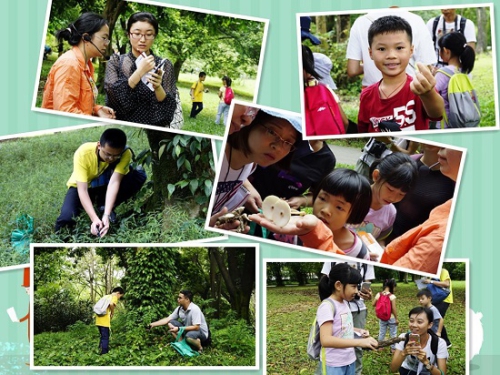 王超群讲解了采集蘑菇标本常用的配备,以及正确的拍摄记录蘑菇标本的方法。大家拿起蘑菇采集记录表出发,在草地上、大树根部、枯叶堆里翻找蘑菇的身影。大家采集到10多份蘑菇标本,王超群讲解这些蘑菇的分类特征,分析大家所拍摄的照片。王超群示范了如何在家制作出蘑菇的孢子印,其秘诀在于选择新鲜的蘑菇菌盖,将之朝下放到干净的纸上,旁边放上一杯水,保持湿润,因为孢子是在潮湿的环境里才会成熟释放,最后用盖子覆盖,静待一夜后,就能在纸上见到伞盖形状的孢子印。采集到的蘑菇标本中,有小皮伞科蘑菇,有菌管满布细孔的多孔菌目蘑菇,还有平时吃的木耳类蘑菇。最令大家惊奇的是一组类似花朵的蘑菇,它的伞盖分裂成多片,颜色外深内浅,犹如花瓣,这是鬼伞,这类蘑菇生命短暂,早上撑起的小伞,傍晚就融化掉。