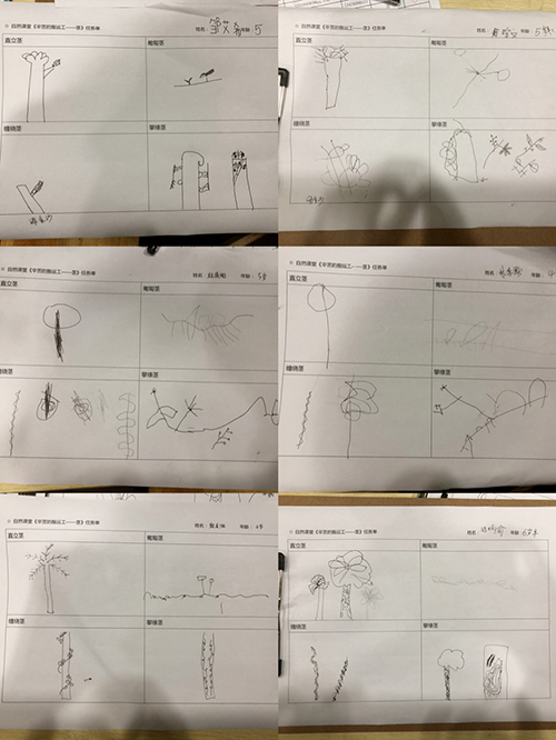 在户外探索的过程中,小朋友们根据课堂上所学植物茎的特征寻找植物。大家直奔温室门口,发现棕榈树,异口同声地说“我们找到了直立茎”,并在任务卡上画上认识到的直立茎;走到小路上,一个小朋友看到树上爬满植物,判断应该是攀缘茎,走近一看,发现在茎节处长有像猫爪一样的不定根,并往上攀援,连忙呼叫其他的小伙伴和爸爸妈妈来观察,做好记录后大家感叹着自然界的神奇;小朋友们发现了“水花生”的匍匐茎,走近一看,原来是茎节处生长的不定根深深地扎在土里。大家通过观察,找到形态各异的茎,并在任务卡上做好记录。