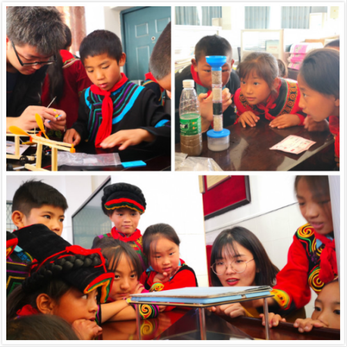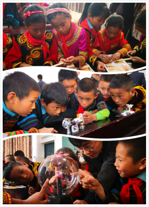 在学校多功能教室,研究生们与身着彝族服饰的孩子们亲密互动,引导开展生动有趣的科学小实验,鼓励孩子们尽情体验光电科技魅力。实验包括太阳能月球探索舰队、风能动力机械兽、辉光球、蒸汽机、神奇三维投影仪、自制净水器、磁悬浮等,孩子们踊跃参与。