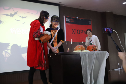 西安光机所博士王超作了题为《高速成像技术:解开超快现象的神秘面纱》的科普报告,为大家解密了分幅相机、条纹相机等尖端高速成像技术背后的“简单且直观”的科学原理,讲解了阿秒脉冲作为新型光源在电子微观运动超快成像领域的应用,以阿秒光开关极高速信息处理技术为例,展示了阿秒光源作为改造自然的尖兵利器,在更新自然认知、提高人类福祉方面的可期前景。科普团队用生活中简单易得的素材,融合知识和趣味,通过“炫彩烟花秀” “液氮蘑菇云”“神奇变声”“火云掌”“空气大炮”等科学实验表演,使大家亲眼见证了光的奇迹和科学的魅力,现场同学们积极参与互动。科普剧《Trick or treat》让大家近距离观看到几种常见实验的变化过程。