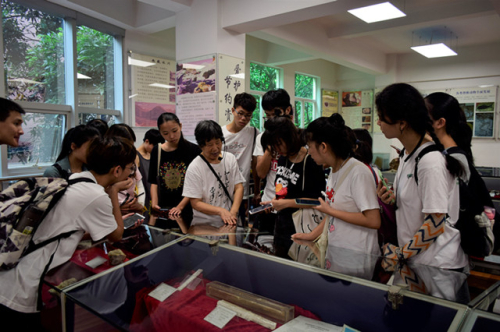 科学家讲解员向同学们介绍了广州地化所的基本概况以及其在学科领域的地位及影响力,带领同学们展开环境地学课程之旅。在科普基地标本馆,同学们被陈列的900余种实物标本所吸引。从经历了低温高压作用的深海沉积物到西北地区形态各异的“沙漠玫瑰”,从云南的自然铜到新疆的古陶片,从宝贵的稀土矿石到色彩缤纷的水晶玛瑙,从侏罗纪、白垩纪的恐龙蛋群体到南海和墨西哥湾的新能源可燃冰,从辽宁的华夏异常鸟到蕴含大量古气象资料的硅化木,从深海区域到西北内陆,从天然矿物矿产资源到人造矿石,从古老的地质年代到最新时期的科学发现,各类标本样品一一呈现。科普志愿者讲解了各种矿物岩石标本,以及古生物化石的来源、特性、用途与研究意义,讲述了科学研究和野外科考时的艰辛与趣事。结合生态学和环境学知识,讲解了“生物大灭绝”、“生物大爆发”、“地球冰期”等地质年代史上的“大事件”。同学们认真聆听并记录,并与科学家展开交流。