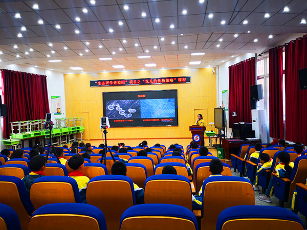 讲老师袁俊青用一朵山茶花引入主题,幻灯片下,花粉、花丝、柱头等各个部位清晰地呈现在学生们眼前;了解花的结构后,袁俊青通过“植物从开花到结果,经历经历了哪些步骤?”等问题,带领大家走进花儿传粉的世界;袁俊青通过丰富翔实的案例介绍了风媒花、虫媒花、水媒花的结构特征和传粉方式,引导同学们思考植物结构特征和传粉方式的关系,将知识性与趣味性相结合,带领同学们探秘植物生命演化的奥秘。她呼吁,尊重自然、保护大自然的生物多样性,引发同学们对人与自然关系的思考;袁俊青等带领学生们分组通过角色扮演的游戏来模拟花儿传粉的策略。