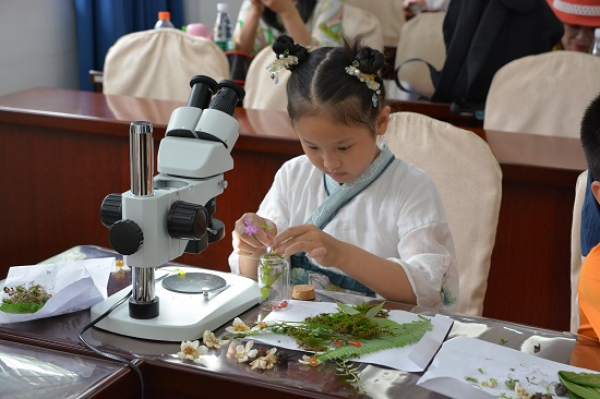 讲座后,同学们到野外采集苔藓标本,发现了八齿藓、白发藓、金发藓、凤尾藓、灰藓等苔藓。同学们在显微镜下观察苔类的胞芽杯和藓类的孢子体,并用采集的苔藓等自然物制作微景生态瓶。