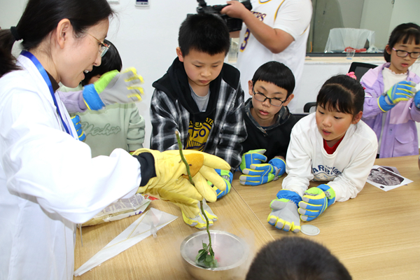 在科学动手小实验环节,地化所月球与行星科学研究中心的科研人员带领小朋友动手尝试了磁性检测、密度测量、镍元素检测等陨石鉴别小实验,并讲解了陨石的来源、收集、种类、鉴别方法等知识。通过将玫瑰花放在温度为-196℃到-210℃左右的液氮中,遇冷后水分凝结成冰,玫瑰瞬间“绽放”等“探寻神秘的冰冻星球”系列实验,模拟出冰冻的外太空中物相转变的奇妙过程,让大家直观感受到物体在外太空低温环境下气相和地球生命会发生的变化。