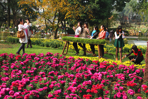 为了营造菊香满园的氛围,今年的布展增加氛围的营造,园区的部分主干道用大小菊和时令花卉装扮一新,在花径广场,6个用红白黄三色菊花做成的菊花拱门热情地迎接游客的到来。在中心草坪,园艺师利用雕塑和扎景的手法制作了大型开屏孔雀造型,用500盆色彩各异的小菊花装点成孔雀开屏的羽毛,呈现出勃勃生机之象。法桐大道两旁,红、黄两色的悬崖菊组成菊花花墙,营造出强烈的视觉冲击。