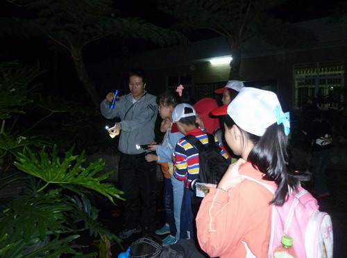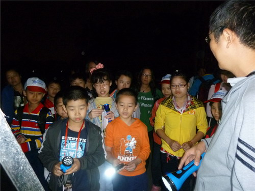 在辅导老师的带领下,孩子们首先学习了昆虫知识,详细了解昆虫的辨别特征、昆虫聪明的伪装技巧及自我保护措施,并认识了躲藏在我们身边、与我们共同生活的的昆虫朋友们。孩子们对虫子如何睡觉颇感兴趣,脑袋瓜里十万个为什么转得快,提出多个疑问与老师频频互动。接着,在野外教学环节,在老师的鼓励下、志愿者的帮助下,孩子们手持电筒,勇敢走进了黑夜里的树林。随着一声声惊叫,孩子们在树洞里发现了大蜘蛛,在大树皮上发现了成群的白蛞蝓,在浅浅的水洼里发现了小福寿螺和它的卵,在枯叶堆里发现了硕大的本地蜗牛……正值狮子座流星雨光临地球,老师还带孩子们一起利用高倍望远镜观起了星象,并一起寻找月亮上面的沟沟壑壑。收获满满的孩子们脸上浮现着欣喜的笑容。