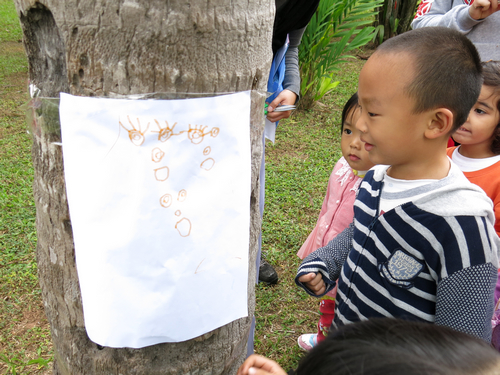 推开自然之门,那里有无限神奇。虽然孩子们每天都有机会在植物园内玩耍,但他们对本期的科普活动还是充满了期待,清晨的低温丝毫没影响孩子们的兴致,在幼儿园老师的带领下,小朋友们早早地就来到了风情浓郁的棕榈园。短暂的热身游戏之后,科普人员把孩子们的注意力引向了当天的主题,先是逐一出示了几件神秘的玩具,让孩子们观察开心、伤心、愤怒、平静等几种表情,然后用提问的方式激发孩子们思考除了人类,还有孩子们熟悉的玩具,植物是否也有表情。小朋友们踊跃发言,大胆提出了各种猜想。随后,小朋友们在老师的带领下寻找并验证他们的猜想。一会儿工夫,每个孩子都在棕榈树上寻找到了有趣的树木表情,即一个个奇特的树洞组合。通过仔细观察和想象,孩子们迫不及待地用手中的白纸和画笔把树的表情进行了再现。活动最后,科普人员带领幼儿参观了所有的树木表情,并引导幼儿总结了他们的探究结果。小班孩子们发现树木是有表情的,不同树洞组合在一起会呈现出不同的表情,中班孩子们不仅发现树木有表情,还猜测了树木的心事,思考了有利或不利于树木成长的因素,大班孩子们则通过自然观察,并为树木画肖像的方式,对比了榕树和棕榈树的树洞特征,体验了两种植物树干的不同,思考了树洞形成的各种原因。