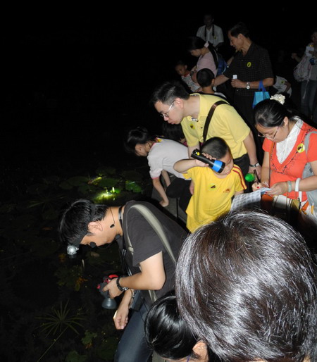 在夜间自然观察中,所有参与活动的孩子们都能坚持走完了全程。许多家长都惊讶自己孩子的表现,平时“骚动不安”的孩子在观察青蛙、蜗牛时都聚精会神;平时胆小的小孩在老师的鼓励下能勇敢地上前与小动物们亲密接触;平时不愿走路的孩子在新奇“诱惑”下,都能顺利完成徒步观察过程。参与活动的家长们普遍认为,华南植物园夜观科普活动为城市里的孩子和家长提供了难得的夜间自然观察平台,不仅是一次学习知识的机会,更是一次培养孩子热爱自然,提高观察能力和团队协作能力,也是亲子零距离互动交流的机会。为让参与者更好地了解相关科普知识,首期活动共发放各类科普宣传手册、书籍、影像资料100余套。
