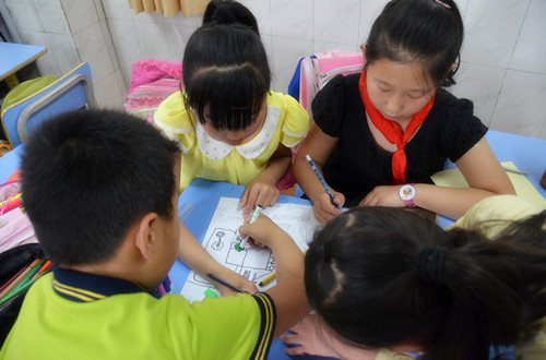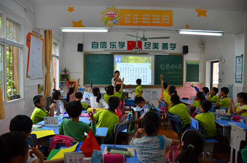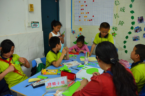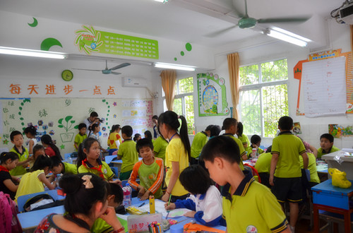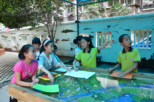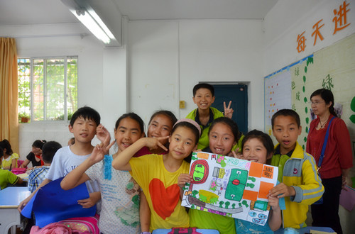 听完理论课后,学生们跃跃欲试想去户外亲自体验。学生被分为6组,由湖北省少年儿童中心田部长带领,实地观察校园环境。学生们细心记录,不时地将校园绿化、文化、服务等设施标注在纸上。观察结束后,同学们回到教室,齐心协力完成本组的校园绿地图。同学们积极开动脑筋,给绿地图设置了很多主题,有“爱护身边的植物与动物”,“校园里的自然和谐生活”、“校园的生态”等等。最后,由小组代表给大家介绍各组绿地图完成的经过及理念。