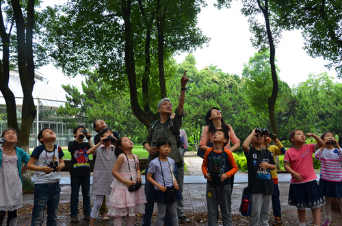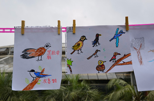 随后,孩子们和家长带着望远镜,拿着观鸟记录本,和李明璞老师一起,轻声细语走进植物园的鸟儿世界。透过望远镜,两只刚出生不久的小喜鹊,扑腾着翅膀 “叽叽喳喳”地叫着不停;对面,一对新晋的乌鸫爸妈正叼着虫子给孩子喂食;温室大草坪前,五六只斑鸠闲庭信步。孩子们兴奋极了,画板上满满记录着观察收获。之后的作品展示环节,孩子们争先恐后地描述观鸟收获,现场欢声笑语不断。
