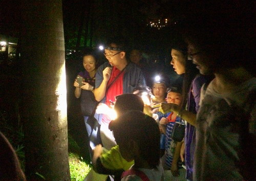 伴着“一闪一闪亮晶晶”的暗夜精灵——萤火虫,孩子们分成两支队伍向丛林进发。硕大笨拙的埃及蜗牛,可爱的小螃蟹,抱对的树蛙,夜里闪着红眼的虾,呆呆害羞的黑眶蟾蜍,软软捏捏的鼻涕虫,护着卵袋的小蜘蛛,还有那鸣叫清脆、节奏响亮的螽斯,不胜枚举的夜间小动物让孩子们惊喜连连,大饱眼福。精彩寻蛙旅、找虫记,还增加了夜观星辰活动。孩子们的自然观察能力超乎想象,每个人都在自然观察记录表上写满自己新奇的发现。