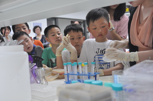 为了能让公众特别是小朋友们走进科学殿堂,巴斯德所还针对小学生安排了别开生面的科学小实验。5月25日下午,小朋友们在老师和家长的带领下陆续来到了生命科学实验楼B楼的开放实验室,开启了一天的科学奇妙之旅。开放实验室里分为四个展台,分别为小朋友们展示了DNA电泳技术、细菌涂板技术、小鼠品系观察和显微镜观察细胞组织形态。实验室的工作人员通过原理讲解、手动实验和科学问答等形式与小朋友们互动和交流,让他们在更轻松愉快的氛围中学习科学小知识。活动过程中,小朋友们和家长积极参与,亲自动手完成一些科研小实验,学习通过显微镜观察微生物、细胞或组织,了解实验鼠的外观差异,分析DNA电泳的原理和方法。一系列活动不仅让他们学到了科学知识,还让他们体验到科学无穷的魅力和乐趣。孩子们在动手实验的过程中积极开动脑筋,发挥想象力,他们用好奇的眼睛发现了许多有趣的现象,也提出了许多天真烂漫的问题。“为什么小鼠的颜色不同”“为什么细胞像向日葵”“DNA是不是在电泳液里游泳?”这些可爱的问题像一粒粒小种子,在孩子们的心中生根发芽,勾起他们对生命对科学最原始的最纯真的向往和好奇。