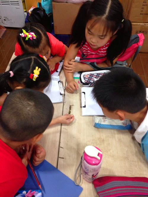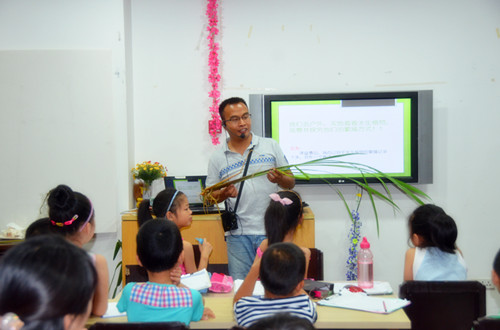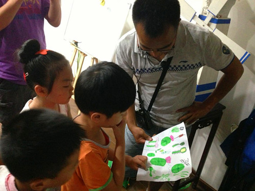 了让孩子们更清楚地了解水生植物,楚海家博士现场剖开眼子菜的花柱,透过放大镜,孩子们观察到眼子菜花柱的细微结构。“细如羽毛的沉水叶”、“充满空气的浮水囊”、“阔而平坦的浮水叶”,在楚海家博士的循循善诱下,孩子逐步感知到水生植物和陆生植物的区别和不同的生长情况。此时,楚海家博士不失时机地向孩子提出问题,水生植物是如何完成繁衍后代的重要任务呢?在孩子们争前恐后,一番极富想象力的抢答后,楚海家博士给孩子们描述了水生植物神奇的授粉绝招:有借助风力和昆虫传播的挺水植物;有借助水媒传播的浮水、浮叶及沉水植物;还有利用地下根茎或不定芽来增加个体数的无性繁殖。