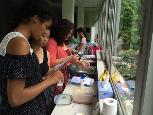 在世界最大的南亚热带植物园,在最具岭南特色的龙洞琪林、药园、兰园、苏铁园等各专类园中,高大魁梧的大王椰子树、硕大扁平的旅人蕉、温柔秀气的笔筒树、挺拔的广州市市花——木棉等植物都让来自北美的学生眼前一亮,甚为惊奇。园艺中心黄瑞兰老师的植物知识课程,让同学们对各类植物的特征和用途留下深刻印象。她巧妙指导同学充分发挥感官,将植物与我们的日常生活紧密联系起来,例如用夏日家庭环保降温佳品——葵扇来解释蒲葵的用途;当介绍荔枝树和黄皮树时,为同学们准备了正当季最受本地人欢迎的夏日佳果——荔枝和黄皮果;在白花花的“电线杆”柠檬桉树下,指导同学们揉碎着落叶,体会浓郁的特别叶香;在药园,面对各式各样的药用植物,用一罐生活中常见的品牌凉茶,让同学们一下子理解了广州人的“凉茶情结”。