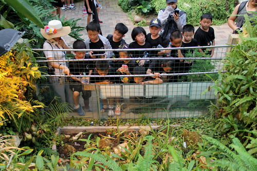 第一主角生长在热带水生植物区。在这里,以热带非洲和热带美洲的水生植物展示了水中居民的娇羞花朵、婀娜身姿,描绘着水中森林的梦幻国度。植物“睡美人”——睡莲正开得欢乐,紫的、粉的、黄的、白的,各式睡莲像造物主打翻了的调色盘。碧叶如盘可载人的王莲正在施展“变温魔法”吸引昆虫在舒服的享受中为其完成传粉。亭亭玉立的荷花袅娜地开着,羞涩地打着朵儿。在这里,孩子们学习了“荷叶效应”。科普老师手把手指导同学们体会何谓“藕断丝连”,详细讲解其中蕴含的科学道理。孩子们现场体验了一把不沾水的“翡翠盘”,并详细了解如何将自然界中的“荷叶效应”运用于现代科技中。