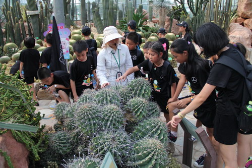 第二主角生长在沙漠植物区。夏日大舞台里,非洲沙漠植物永远是最耀眼的明星。非洲霸王树、光棍树 、猴面包树、鬼切芦荟等沙漠植物在夏日里更加焕发着生机与活力。最吸引孩子们的还是美丽的“沙漠玫瑰”。沙漠玫瑰即使被连根拔起,死去般枯黄,但只要放入水中,就能再次焕发生命的活力。孩子们被各类生命力顽强的沙漠植物深深感动,还亲手感受了一番沙漠植物的不同“武器”。