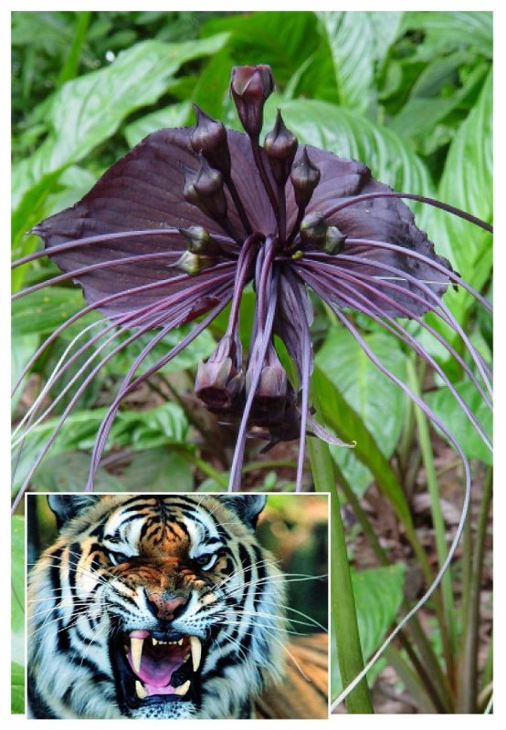 神奇美丽的西双版纳因其至今还保存着大面积热带雨林而享誉世界,在这郁郁葱葱的浩瀚林海中蕴藏着许多神奇的植物,其中有一种被称为“老虎须”的奇花一定会让你过目难忘。瞧它那下垂的丝状小苞片,长达几十厘米,形如胡须,整个花序看上去就象一张呲牙咧嘴的老虎的脸;另外,它的花序拥有两片垂直排列的紫黑色的大苞片,又使整个花序活象一只飞舞的蝙蝠;再加上它独具晦暗颜色,在阴暗的热带雨林下面咋一看不禁让人感到毛骨悚然,因而,它除了被称之为“老虎须”外,还有“蝙蝠花”或“魔鬼花”等别名。其谜一样的花展示,相信会让每一个在热带雨林中邂逅到它的人感到诧异并为之浮想联翩。