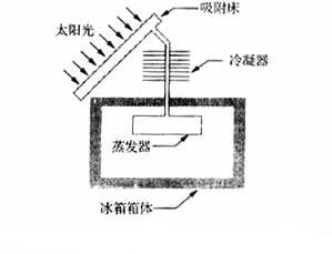 太阳能吸附式制冷系统式利用固体吸附剂在低温时吸附制冷剂和在高温时解吸制冷剂的工作原理进行工作的,当白天有阳光的时候太阳能集热器收集热能,吸附床温度升高,制冷剂从吸附剂中解吸出来,这样吸附床中压强升高,推动制冷剂进入蒸发器和储热器,当夜晚等太阳能不足的时候,则过程正好相反,蒸发器中液态制冷剂蒸发,产生制冷效应,制冷剂蒸气进入吸附床重新被吸附,完成一次制冷循环。