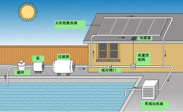 太阳能游泳池就是利用太阳能集热器收集太阳辐射热量加热从游泳池抽入太阳能集热器中的水,然后再把热水排入游泳池,如此反复循环则游泳池中的水温逐步升高达到人类游泳舒适温度后通过流量控制阀维持游泳池水温基本处于一恒定值。为了弥补某些时候太阳能的不足,还可以加入常规加入器加热游泳池中的水。