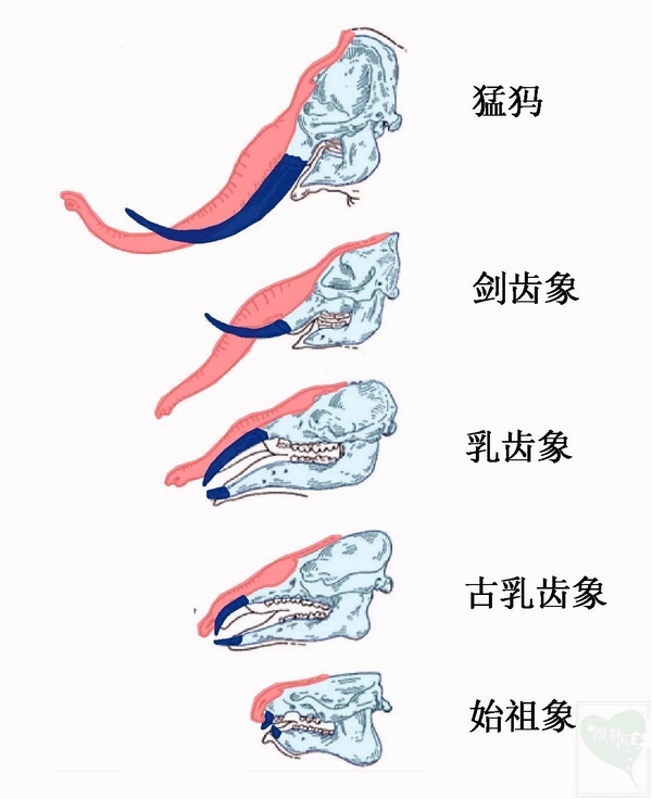 长鼻目象鼻和象牙的进化,自上而下分别是猛犸、剑齿象、乳齿象、古乳齿象和始祖象( 冯利民根据 Erich Thenius原图绘制)