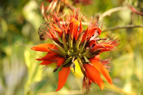 在百花园的一角,你可以看到这样一种植物:花开得鲜红绚烂,叶子有金黄色的叶脉,可谓花叶俱美,这就是著名的观赏植物——金脉刺桐!