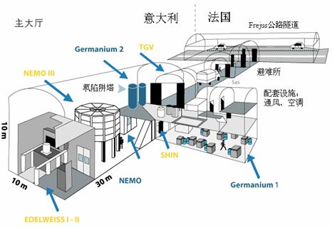 法国Modane地下实验室位于法国东部罗纳 — 阿尔卑斯大区(La région Rhône-Alpes)萨瓦省(La Savoie)的边境小镇Modane地下,简称LSM(Le Laboratoire Souterrain de Modane)。LSM深藏于阿尔卑斯山脉弗雷瑞斯山峰(Le Mont Fréjus)下1700m的岩石中,处于连接法国萨瓦省和意大利西北的皮埃蒙特(Piémont)大区的弗雷瑞斯交通公路隧道(Le Tunnel Routier de Fréjus)的正中央,离入口处约6.5公里。LSM地下实验室面积400m2,空间容积约3500m3。
