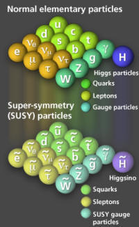 为了克服大统一模型的缺点,科学家们对于是否存在着更大的对称性更加关注。1973年时有人提出来一个巧妙的数学结构,称为超对称(super-symmetry)理论(左图)。按照这一理论,费米子和玻色子都填入同一线性表示中,通过规范作用可以互相转化。为了达到这一目的,理论不得不在已知的微观粒子基础上引入大量配偶粒子。超对称理论形式十分美妙,可惜这些配偶粒子至今都没有找到。