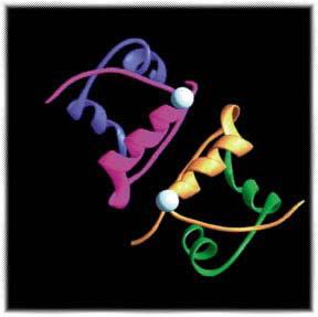 本图为利用中子散射技术观测到的含有锌离子的两个胰岛素分子结构。为便于中子衍射研究,需将胰岛素分子晶体化。在其晶体化过程中,胰岛素分子吸附锌离子(图中的白色小球)。