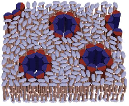 本图为在美国阿贡国家实验室强脉冲中子源上开展的利用中子散射研究某个样品的结果。该样品显示肽(圆柱体)在细胞膜中形成孔并将自身嵌入其中。