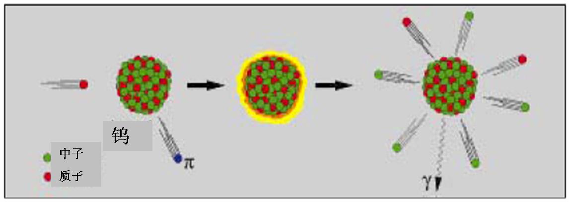 当一个高能质子,打到重原子核上时,一些中子被轰击出来,这个过程被称为散裂反应。被轰击的原子核温度升高,更多的中子就会“沸腾”起来并脱离原子核的束缚。如果将一个垒球用力投到装满球的筐中,有一些球会立刻蹦出来,而更多的球则会弹跳并翻出筐外,散裂反应与这个过程很相似。每个与原子核相作用的质子能够轰击出20到30个中子。